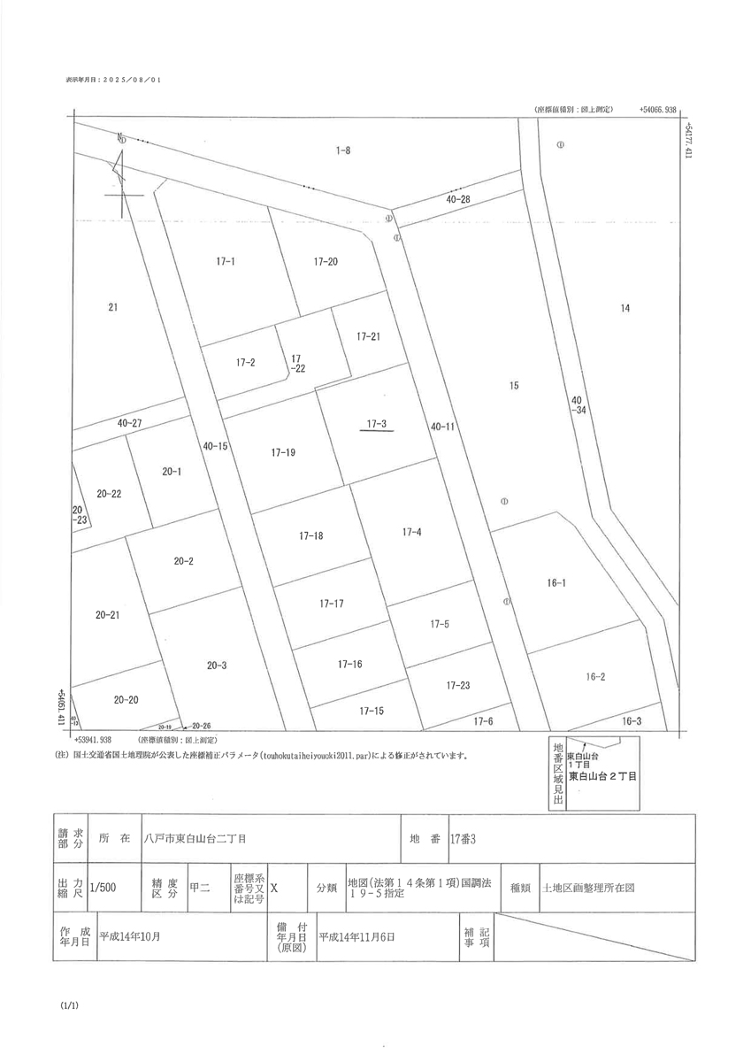 備 考 | 附属建物有り(車庫:軽量鉄骨亜鉛メッキ鋼板葺平家建・30.16u・平成9年7月1日新築) | ||